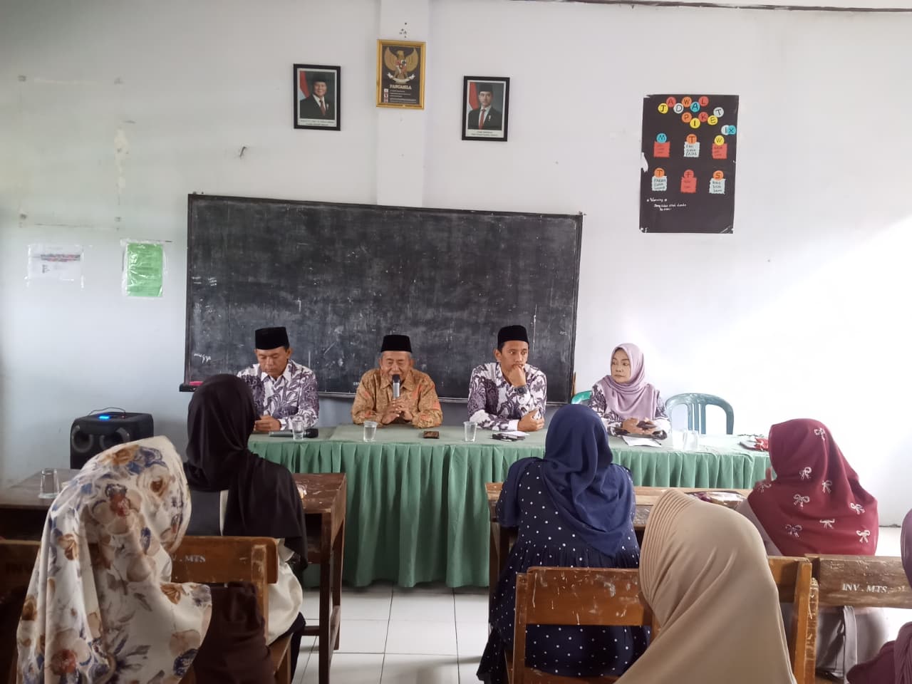 Kalirejo, 22 Agustus 2025 – Madrasah Tsanawiyah (MTs) Miftahul Huda Kalirejo menggelar rapat bersama wali murid bertempat di Aula Madrasah. Acara ini dipimpin langsung oleh Kepala Madrasah beserta dewan guru, yang sekaligus memberikan arahan dan sosialisasi mengenai program-program strategis madrasah dalam rangka peningkatan kualitas pendidikan dan pelayanan kepada peserta didik.Dalam sambutannya, Kepala Madrasah, Khoiroti, S.Sos menyampaikan tentang pentingnya pemanfaatan teknologi melalui program SIMS (Sistem Informasi Manajemen Sekolah). Program ini diharapkan dapat menjadi jembatan integrasi antara pihak madrasah dengan wali murid, terutama dalam hal layanan administrasi dan informasi, mulai dari pembayaran, absensi siswa, hingga laporan perkembangan belajar. Dengan sistem ini, wali murid dapat memantau secara langsung aktivitas dan progres anaknya di sekolah.Selain itu, sosialisasi juga menekankan pada program unggulan madrasah yaitu pembelajaran kitab kuning/gundul. Program ini bertujuan membekali peserta didik dengan keterampilan membaca, memahami, dan mengkaji kitab-kitab turats sebagai ciri khas pendidikan berbasis pesantren. Kepala Madrasah menegaskan bahwa penguasaan kitab kuning akan menjadi bekal penting dalam memperdalam ilmu agama sekaligus melestarikan tradisi intelektual Islam.Tak hanya itu, arahan juga diberikan mengenai sistem proses belajar mengajar di MTs Miftahul Huda. Kepala Madrasah menekankan pentingnya kolaborasi antara guru, siswa, dan orang tua dalam menciptakan lingkungan belajar yang kondusif, disiplin, dan berkarakter.Rapat berlangsung dengan penuh antusiasme. Para wali murid memberikan tanggapan positif atas program-program yang disampaikan serta mendukung penuh langkah madrasah dalam meningkatkan mutu pendidikan.Dengan adanya sinergi antara pihak madrasah dan wali murid, diharapkan MTs Miftahul Huda Kalirejo semakin maju dalam mencetak generasi yang cerdas, berakhlak mulia, dan berdaya saing.Sosialisasi Bantuan Pembangunan Gedung 2 Lantai MTs Miftahul Huda